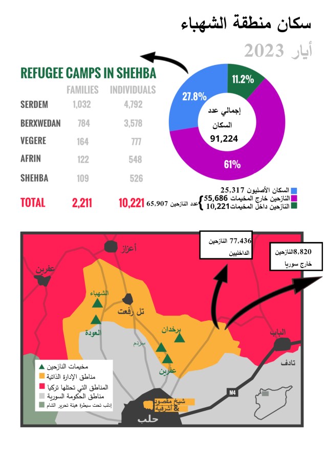 تعد منطقة الشهباء مثالاً آخر على عدم وجود حل للحرب الأهلية السورية، وما يترتب على ذلك من عواقب، إن النسيان الذي تجد المنطقة نفسها فيه هو نتيجة لتطور الحرب، ولكن أيضاً نتيجة للتطلعات إلى سوريا ديمقراطية، كانت المنطقة سيناريو معارك متتالية بين الجيش العربي السوري والجيش السوري الحر وداعش وقوات سوريا الديمقراطية. في فبراير 2016 بدأت مقاطعة الشهباء التابع للإدارة الذاتية لشمال وشرق سوريا، في التعافي من الاشتباكات السابقة، لكن غزو الجيش التركي والميلشييات الوكيلة له في الجيش الوطني السوري عام 2018 أجبر ما يقدر بنحو 300000 شخص على مغادرة المنطقة، ومن هؤلاء لا يزال أكثر من 100,000 نازح داخلياً في مقاطعة الشهباء، في انتظار العودة إلى عفرين، ولا يزال 10221 نازح داخلياً يعيشون حالياً في خمسة مخيمات للاجئين في منطقة الشهباء.