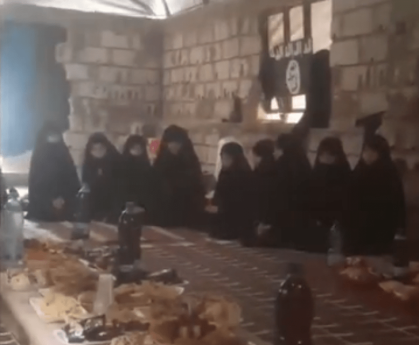 Group of girls in al-Hol’s foreigners’ Annex during a ‘graduation ceremony’ under ISIS banner (see below).